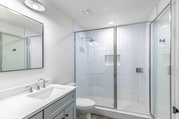 This 2 bedroom 2 bathroom home features beautiful wood-look vinyl flooring throughout and ample windows that fill the main living areas with natural light. The full kitchen has new stainless appliances, custom all-wood cabinets, a pantry, and a breakfast bar that overlooks the living room. The kitchen and bathrooms all boast beautiful quartz countertops.