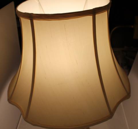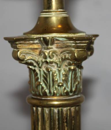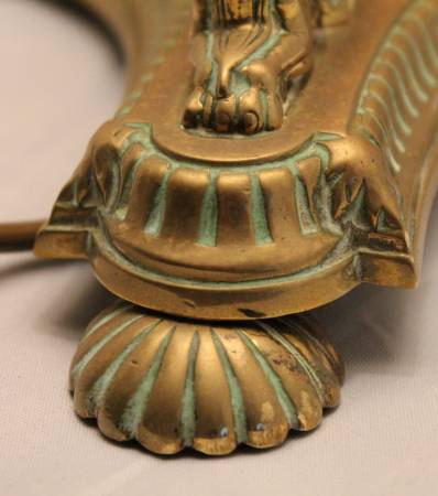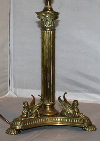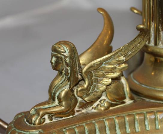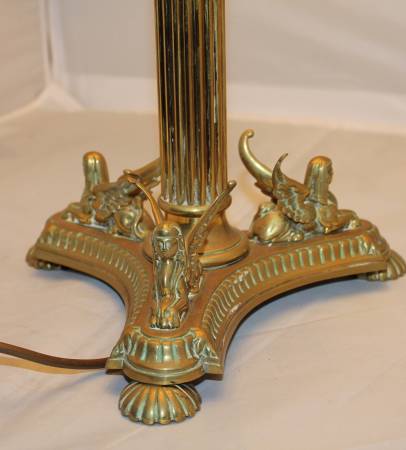 Antique Scottish Solid Brass Banquet Oil Lamp converted to an electric lamp. Egyptian Revival with Winged Sphinx design. Bras lamp base circa: 1860s - 1880s (possible older). Converted to electric in Scotland pre 1947 (England and Scotland changed their plug type in 1947, this lamp had an old fashioned plug on it). Converted to American by changing plug and using a light socket converter. Vintage Scottish lamp shade.