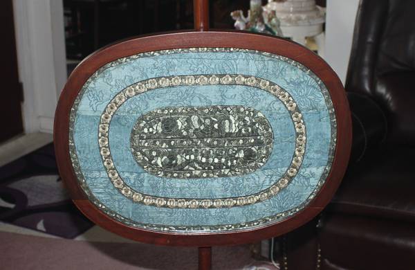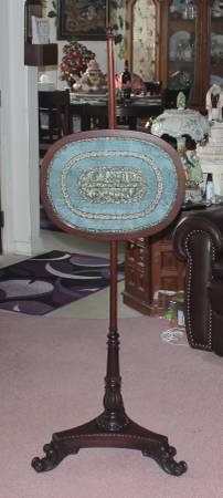Antique Victorian Scottish Mahogany Pole Fire Screen / Fireplace Face Shield. Circa: 1920 - 1860. Handmade needlepoint floral decoration on screen. Fireplace pole screens were used in upper class homes to shield a woman's face from the heat of the fire. Makeup of the day was wax based. Too much heat would cause it to melt and look unsightly.