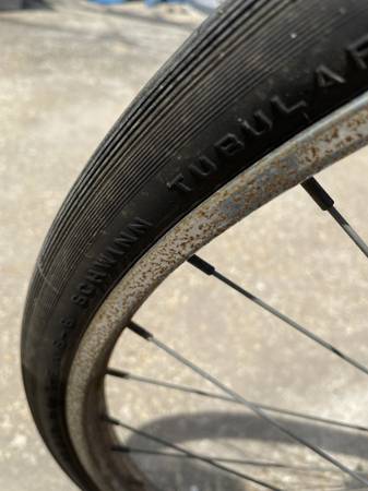 This has been stored in a garage for about 60 yrs. It is about 65yrs old. Still has original 26 X 1-3/8” Schwinn Touring tires in excellent condition chain if off needs chain