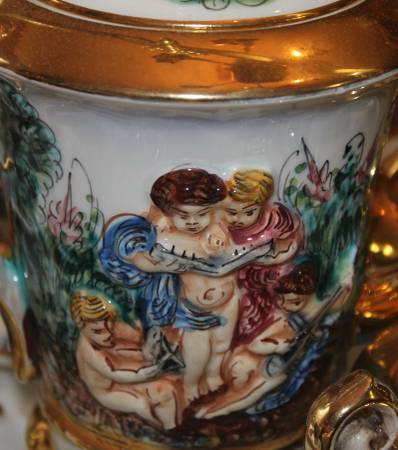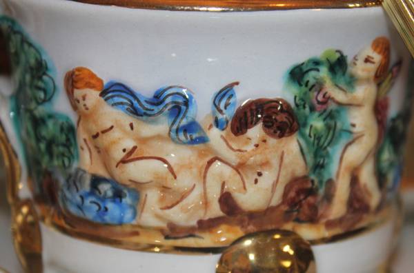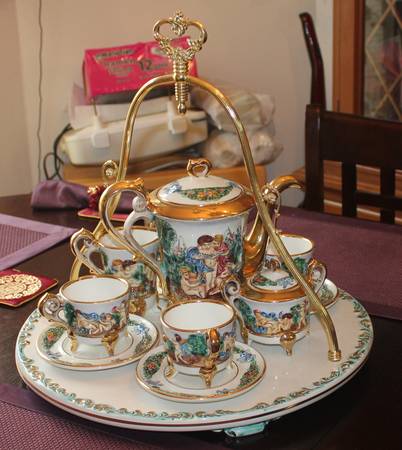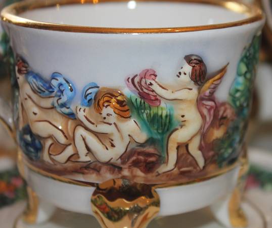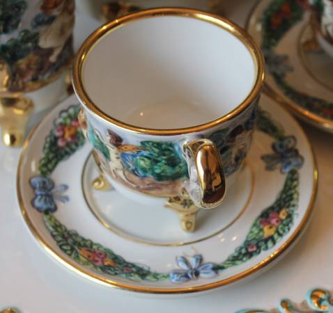 Capodimonte 14 Piece Tea Set. 4 Tea Cups with Saucers, Tea Pot with Lit, Creamer, Sugar Bowl with Lit, Platter with Handle.