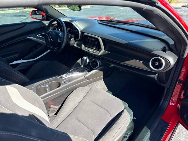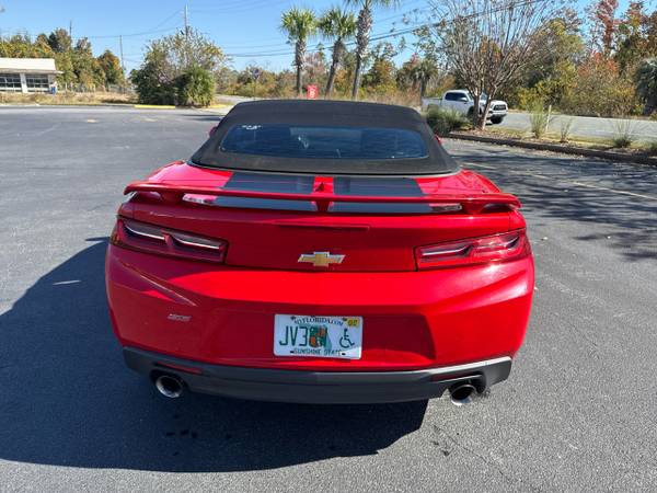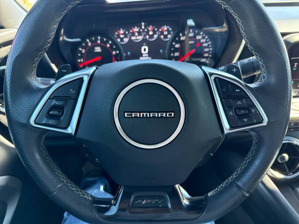 Get behind the wheel of this exhilarating Red 2017 Chevrolet Camaro and experience the raw power of the 6.2L V8 engine, delivering an impressive 455 horsepower. The rear axle with a 3.73 ratio and limited-slip differential ensures a thrilling ride every time. With four driving modes to select from, including Snow/Ice, Tour, Sport, and Track, you can customize your driving experience to suit your mood. Equipped with Brembo performance brakes, a capless fueling system, and summer-only run-flat tires, this Camaro is ready to dominate the road. The sleek exterior features a rear spoiler, high-intensity discharge headlamps, and power-adjustable body-color mirrors. Inside, you'll find a leather-wrapped flat-bottom steering wheel, eight-way power driver's seat, and an enhanced driver information center with an 8" diagonal multi-color display. Safety features include a rear vision camera, stability control system, and dual-stage frontal airb