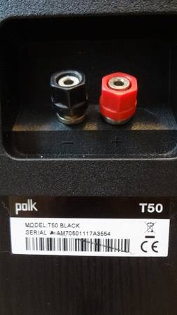 The Polk Audio T50 is a 150-watt (peak) floor-standing tower speaker with a 2.5-way bass reflex design, featuring a 1-inch silk dome tweeter, a 6.5-inch Dynamic Balance composite woofer, and two 6.5-inch passive bass radiators for enhanced low-frequency response. It offers a total frequency response from 38Hz to 24kHz, has 90 dB efficiency, and a nominal impedance of 6 ohms, making it a suitable entry-level option for home theater and stereo systems.