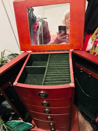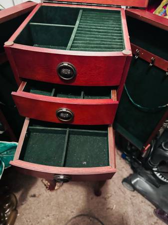 Nice Cherry wood jewelry armoire. Lots of drawers made specifically for rings, bracelets, earrings and sides also come out to hang necklaces on. Good condition- asking $50.