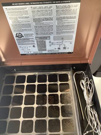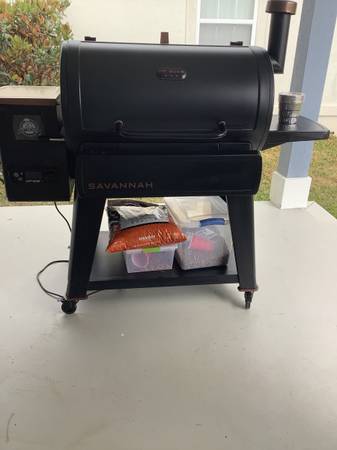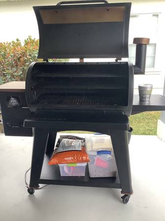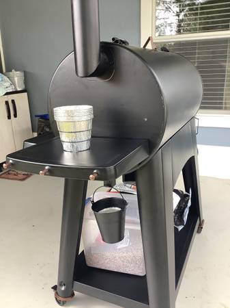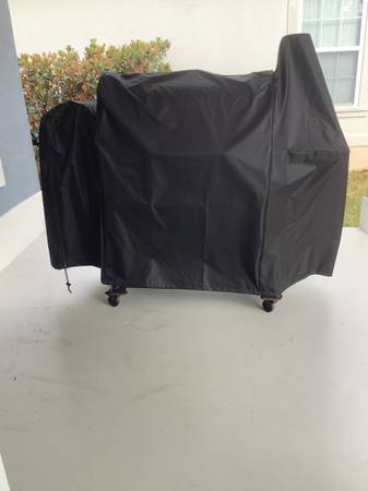 New, only used three times. Selling because as a senior it is just too large. Comes with cover, pellets and several drip pans. It has been stored with cover and under roof on the patio.