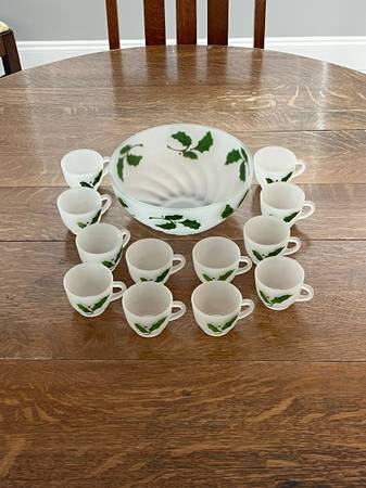 Vintage Christmas frosted glass punch bowl with 12 cups. Holly berry design. The set includes 12 cup crystal bowl and 12 four ounce matching cups.