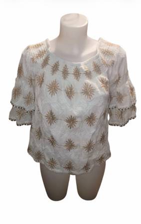 Boston Proper Ivory Off-Shoulder Ruffle Shirt, Size XS, 3/4 bell sleeves, pretty gold accents, excellent condition. The shirt is a relaxed fit and can also fit a size small. Perfect for any occasion, made of 100% cotton. From a smoke free and pet free home. Accepting cash only.