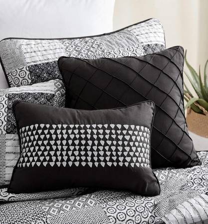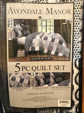 NEW Avondale Manor 5 Piece Evangeline Quilt Set, Queen Size, Black/White, never used, still in original packaging, includes two decorative pillows. Retail $140, selling for $50. From a smoke free...