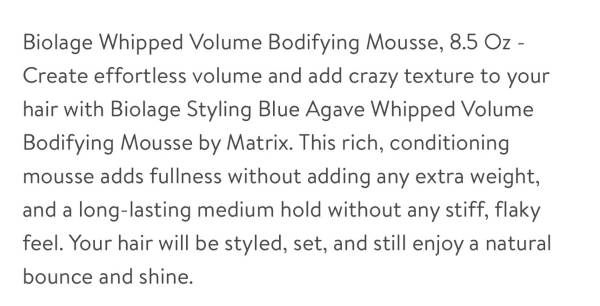 NEW Biolage Styling Blue Agave Whipped Volume Bodifying Mousse, retail $17, selling for only $10. Very high quality mousse to add nice volume, bounce and shine to your hair. Accepting cash only.