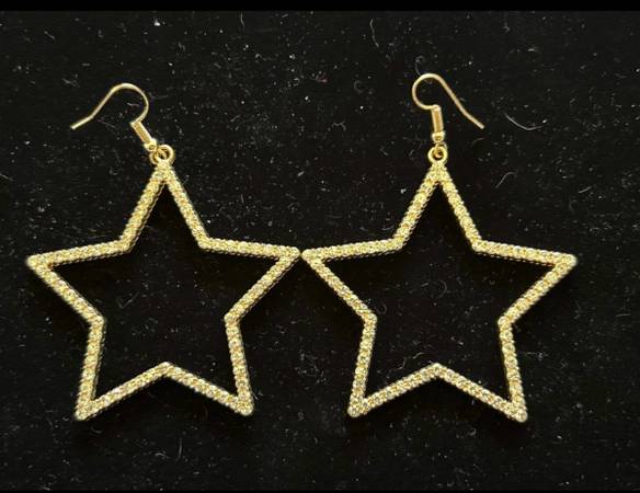 NEW without tags, one pair of large, rhinestone, gold tone star earrings, never worn, lightweight, very sparkly and cute for any occasion. From a smoke free and pet free home. Accepting cash only.