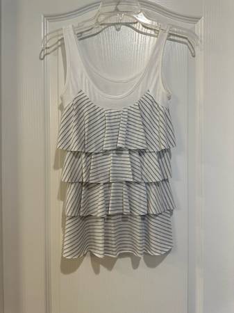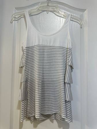 NEW without tags, Women’s Ruffle Sleeveless Top, size small, cotton blend cream color with light gray stripes, never worn, cute fun top. From a smoke free and pet free home. Accepting cash only.