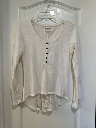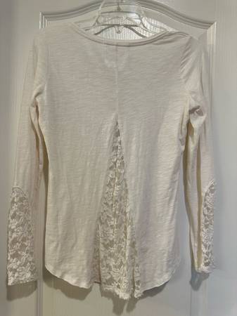 Women’s Cotton-Blend Lace Shirt, size small, excellent condition, worn once, cream color, lace on bottom of sleeves and on the back center of shirt, lightweight thin shirt, perfect for any occasion.