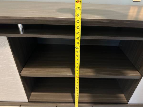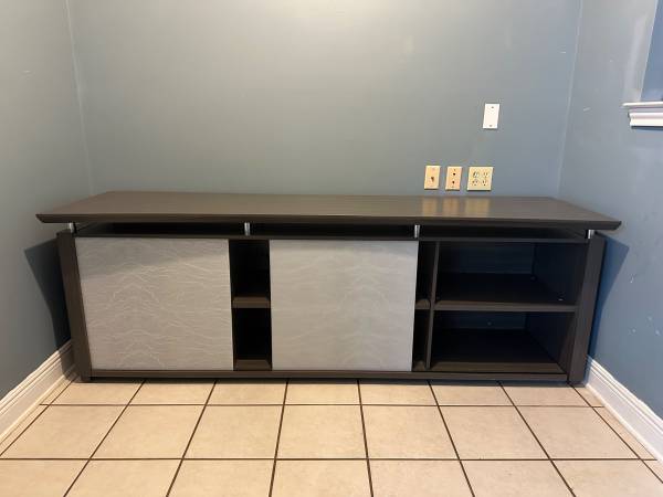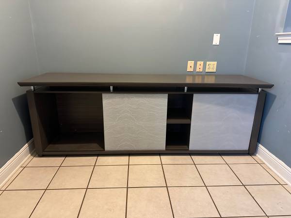 Selling this credenza. 72" wide so it's pretty large. Two bays on each side. Left side has the whole bay open and can fit a small equipment rack. Right side bay has a shelf that can be removed during install. Both bays have built in fans for exhaust.