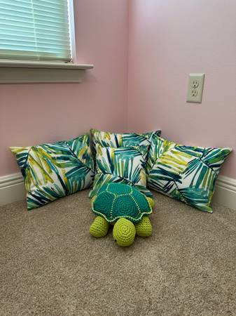 NEW Decorative 4 tropical bed pillows with a handmade matching turtle. Beautifully custom designed collection to showcase your bedroom. From a smoke free and pet free home. Accepting cash only.