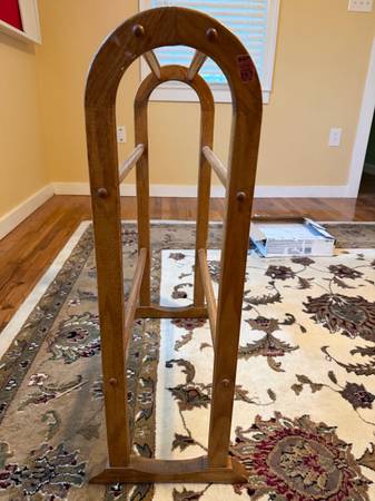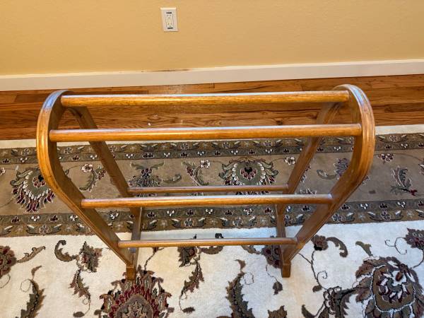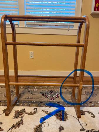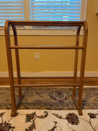Vintage Solid Oak Wood Blanket Rack, sturdy good condition (see photo for one small two-inch scuffed area in lower right leg on the back side), front side of holder looks fine, 23.25” L x 8.75” W x 30” H, a rare antique find, quality crafted, can hold many small blankets, quilts or afghan blankets. From a smoke free and pet free home. Accepting cash only.