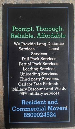 We are Prompt.Thorough.Reliable. Affordable. We provide long distance service, local service pack service, Partial pack service, Loading service, unloading service and Third, party service and loading or unloading storage unit service too.Call for free Estimate. Military Discount and we do 95% Military service do to we are very professional and we love what we do. 8509024524