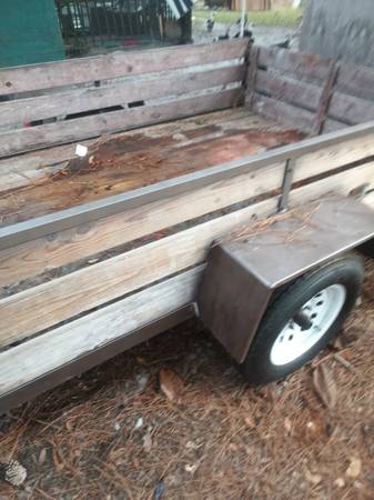 6' x 10 metal framed wooden side trailer for sale has tilt bed front and rear gates slide out, new tires newer wiring harness. Frame in great shape siding very good