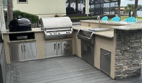 Outdoor kitchen with Primo ceramic Grill, gas grill & griddle.