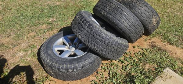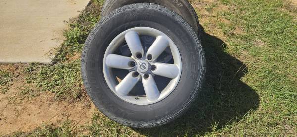 Set of 4, 18" Nissan Titan wheels. Came off a 2010 Titan. Wheels in good shape, tires are 265/70/18, 2 matching with theead left, 2 non-matched. One has a bolt in it. $75.00 or best offer.